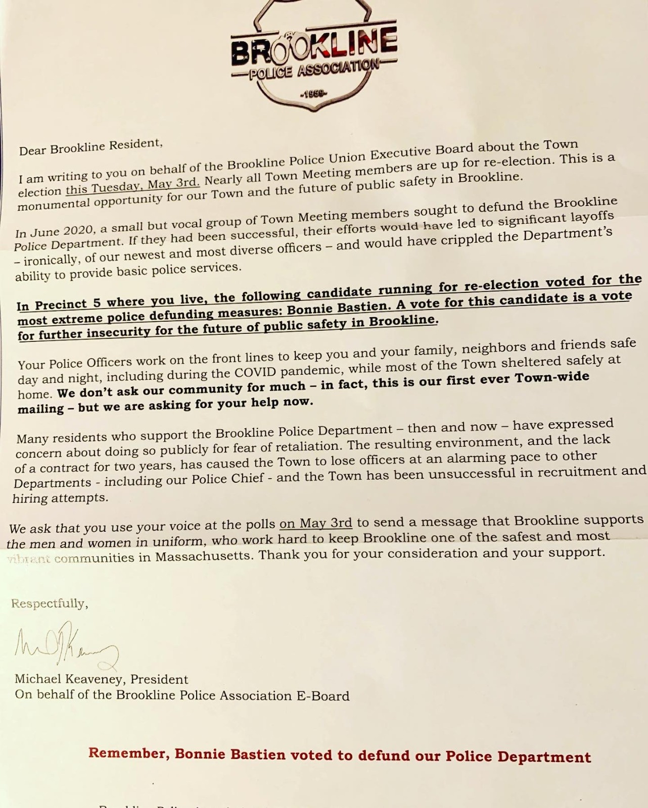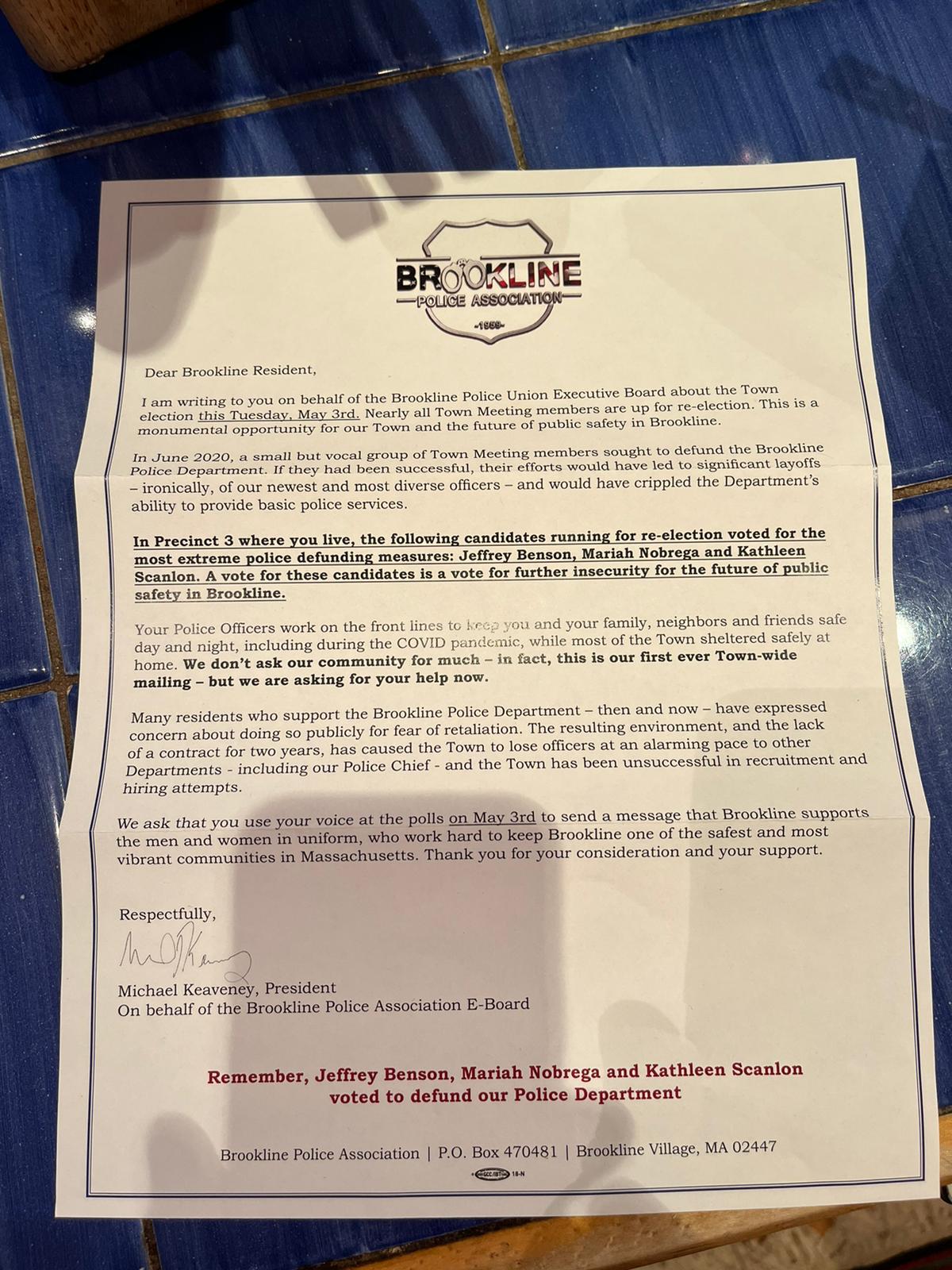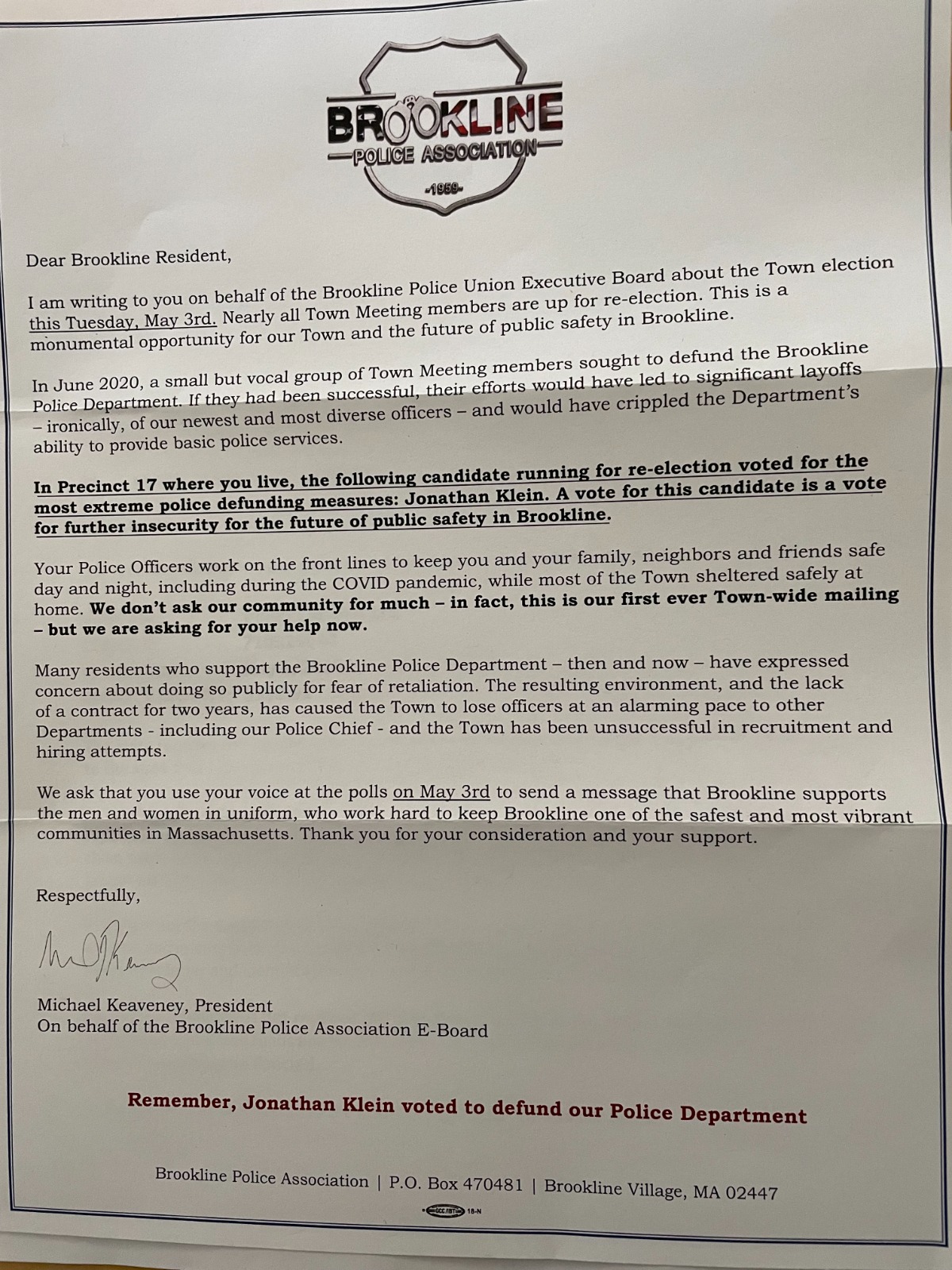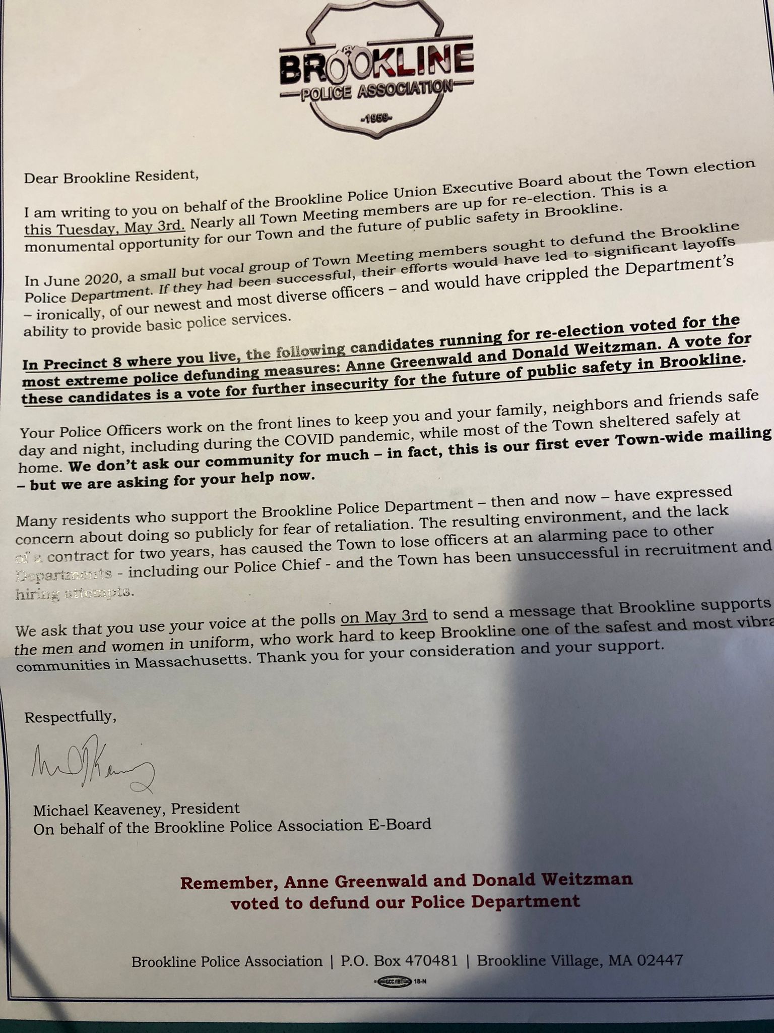 The Brookline Police Association has targeted Brookline leaders in a town-wide mailer with prominent handcuffs retaliating for a budget vote taken at the height of the pandemic in June 2020. Those targeted include members of the School Committee, Housing Advisory Board, the chair of the Library Board of Trustees, the chair of the Town's Green Caucus, the chair of the Zero Emissions Advisory Board, the former acting chair of the Commission for Diversity, Inclusion, and Community Relations, the Town Advisory Committee (finance committee), and others who have been effective advocates for equity, the schools, our libraries, climate, housing, and fiscal oversight in Town. In precincts 4, 5, 12, and 17 only one candidate appears, singled out in red and accused of contributing to "insecurity" on the letter sent to their entire neighborhood.