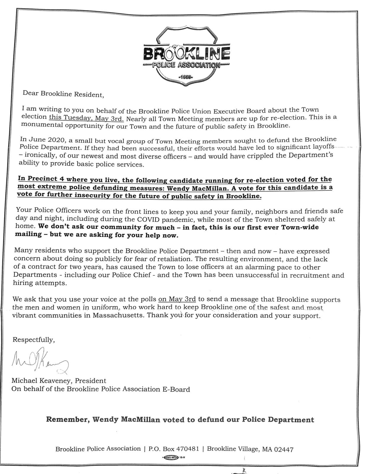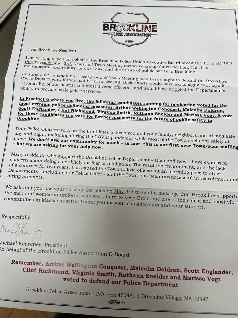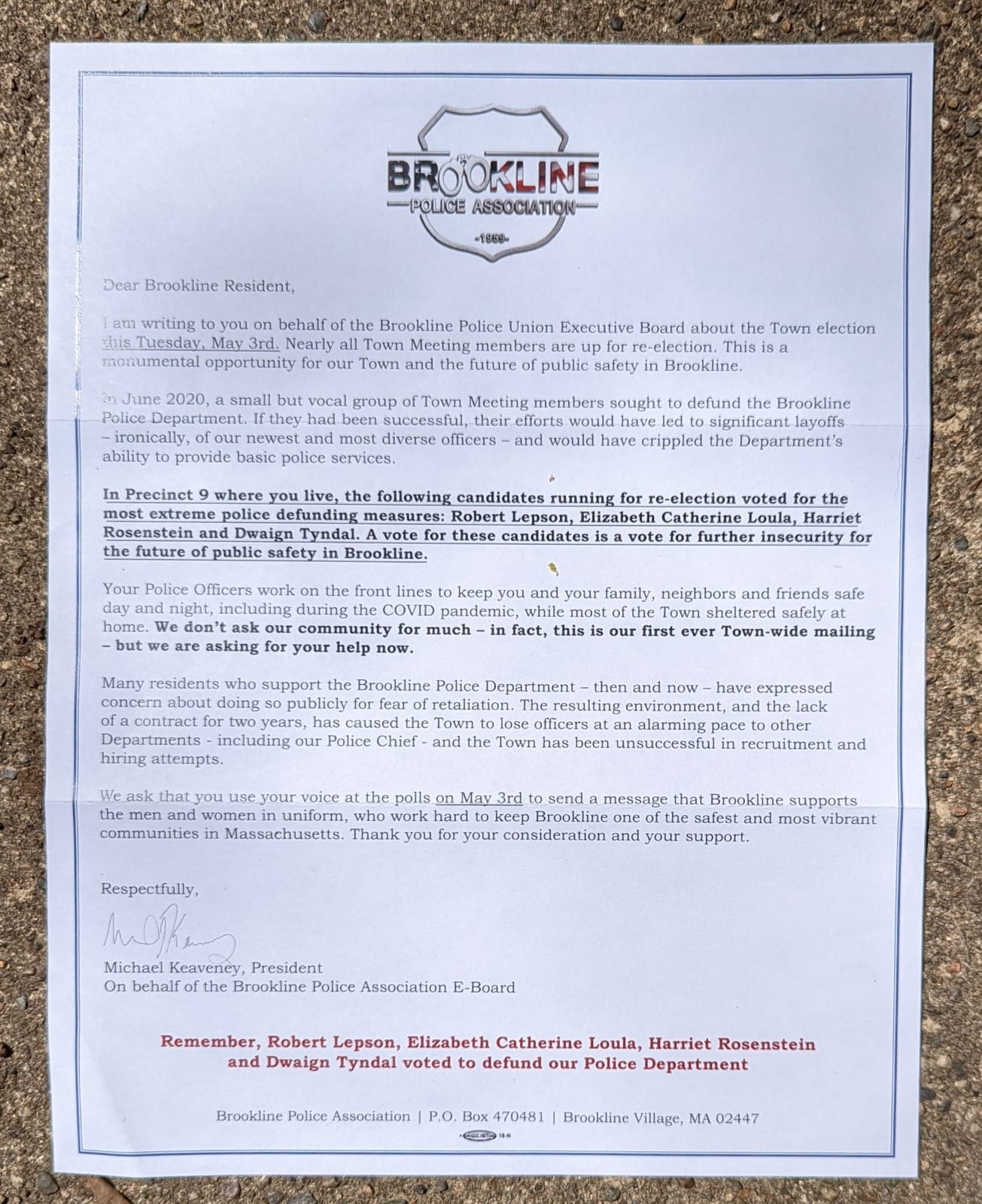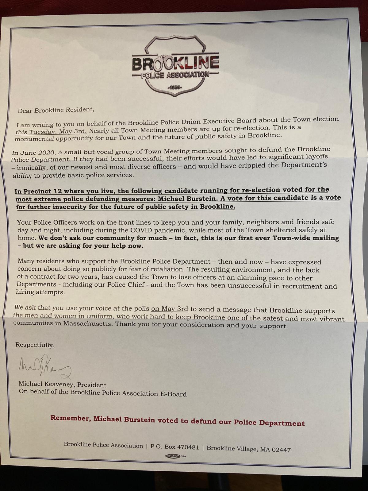 The Brookline Police Association has targeted Brookline leaders in a town-wide mailer with prominent handcuffs retaliating for a budget vote taken at the height of the pandemic in June 2020. Those targeted include members of the School Committee, Housing Advisory Board, the chair of the Library Board of Trustees, the chair of the Town's Green Caucus, the chair of the Zero Emissions Advisory Board, the former acting chair of the Commission for Diversity, Inclusion, and Community Relations, the Town Advisory Committee (finance committee), and others who have been effective advocates for equity, the schools, our libraries, climate, housing, and fiscal oversight in Town. In precincts 4, 5, 12, and 17 only one candidate appears, singled out in red and accused of contributing to "insecurity" on the letter sent to their entire neighborhood.