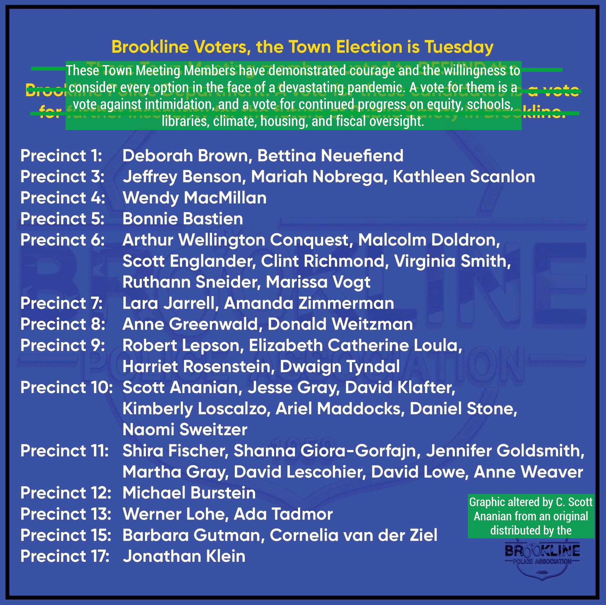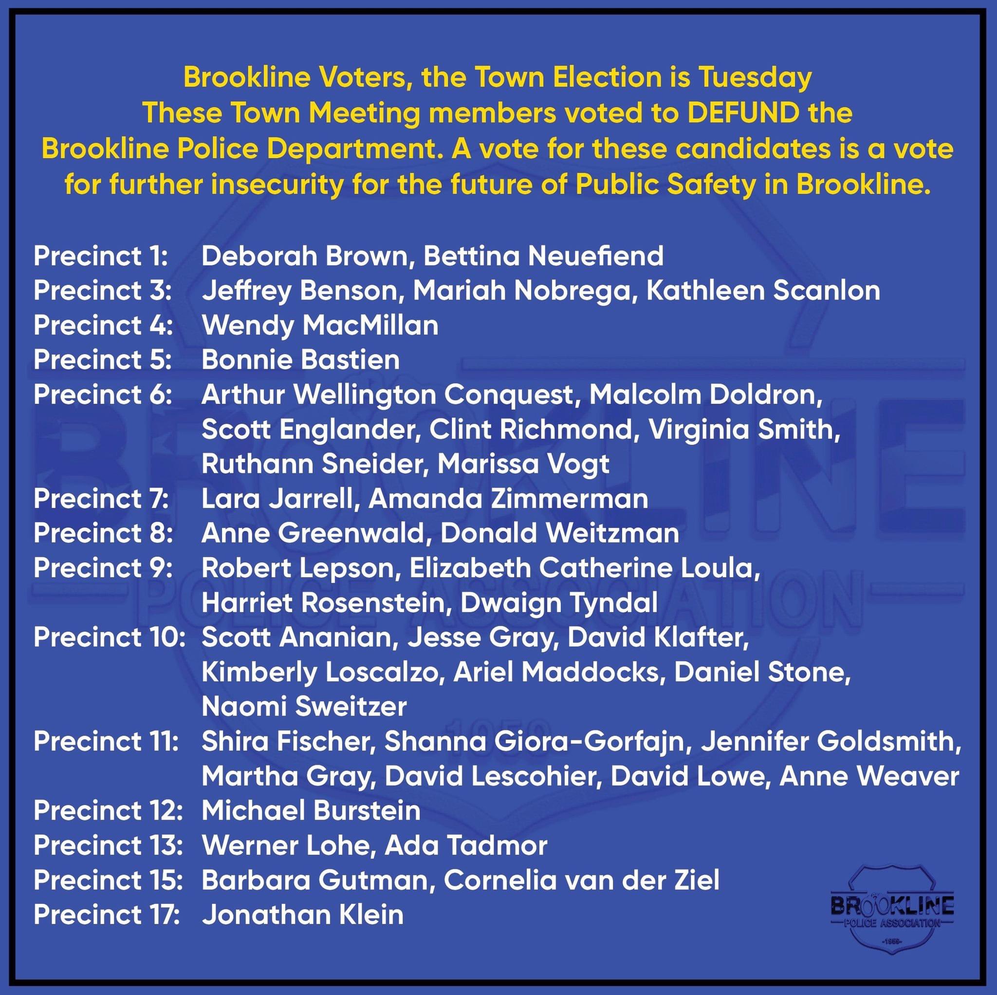 Needless to say, no other unionized Town Department has seen cause to target Town Meeting members for their budget vote in 2020, despite several Town Departments taking much sharper cuts. Given the participation of the Brookline Police Department in safeguarding the security of our election process, targeting individuals by name casts doubt on the department's ability to impartially safeguard canvassers on Election Day.